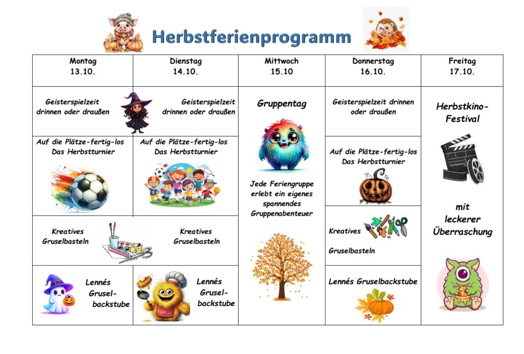Wir freuen uns auf ein tolles Ferienprogramm mit Ihren Kindern und wir wünschen uns allen schöne und entspannte Herbstferien.