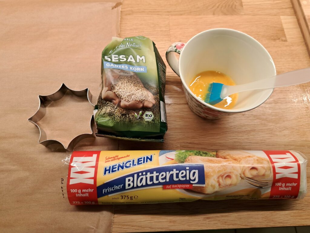 Am besten lässt sich der Blätterteig mit einem großen Keksausstecher, oder einem Glas, ausstechen. In meinem Fall habe ich einen großen Ausstecher in Sternform genommen. Aber sicher sehen auch Tannenbäume, Herzen oder andere Ausstecher gut aus. Achtet aber darauf, dass der ausgestochene Blätterteig nicht zu klein ist, da er beim Aufbacken noch kleiner wird.