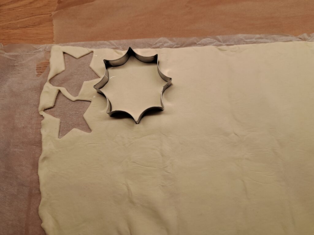 Ihr beginnt damit, den Blätterteig gerade auszurollen und könnt nun mit dem Ausstecher, wie bei Keksen, eure Wunschform ausstechen.