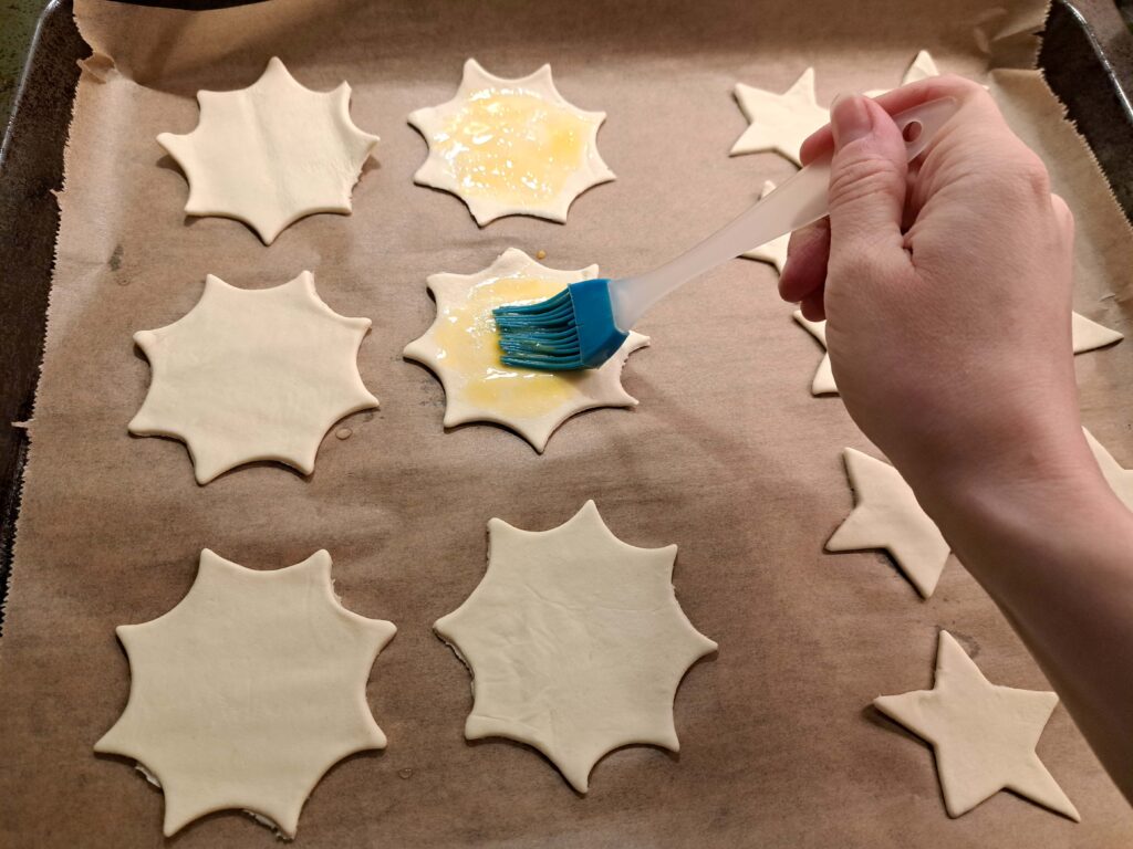 Um die Blätterteigsternchen richtig knusprig und schön braun zu bekommen, bestreicht ihr sie am besten mit ein bisschen Eigelb.