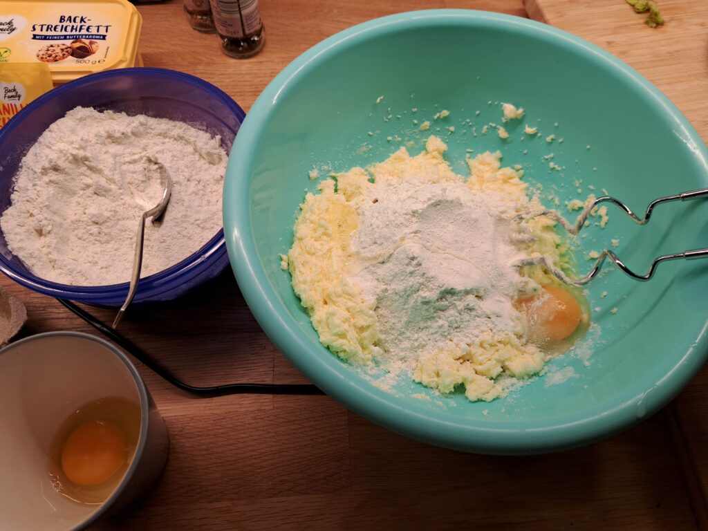 Zuerst verrührst du die Butter, Zucker und Vanillezucker mit einem Handrührgerät, man nennt das „schaumig schlagen“. Dann fügst du die Hälfte der Mandeln, eine Prise Salz und das Ei hinzu. Beginne jetzt langsam, während du alles mit einem Handrührgerät vermischt, damit immer ein bisschen mehr Mehl unterzumischen. Das macht man, damit nicht alles auf einmal sehr staubt. Wenn alles gut verrührt ist, schütte noch die restlichen Mandeln hinzu und vermische sie ebenfalls.