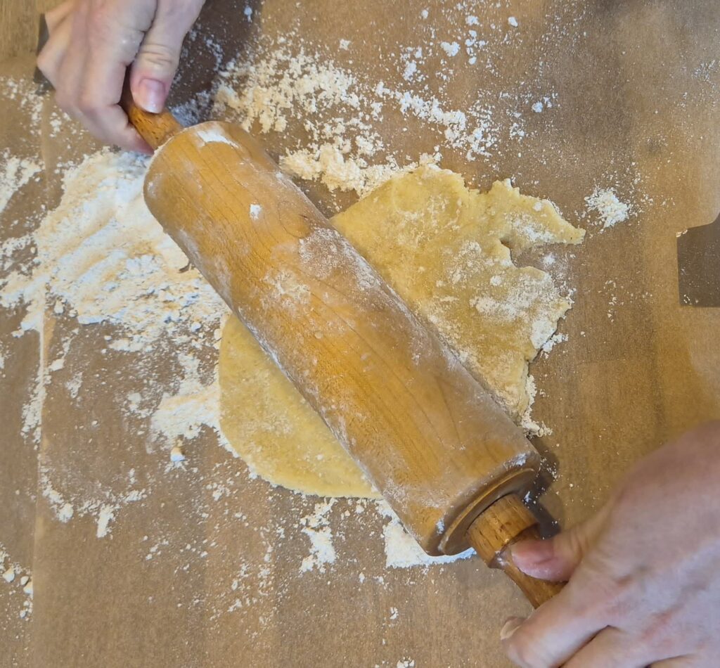 Am nächsten Tag kannst du den Keksteig mit einer Teigrolle ausrollen und dann mit Ausstechförmchen Kekse ausstechen. Dazu streust du vorher ein bisschen Mehl auf eine Unterlage (z.B. ein Stück Backpapier) und rollst dann den Teig zu einer dünnen Masse aus.
